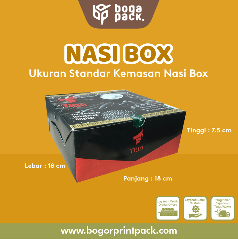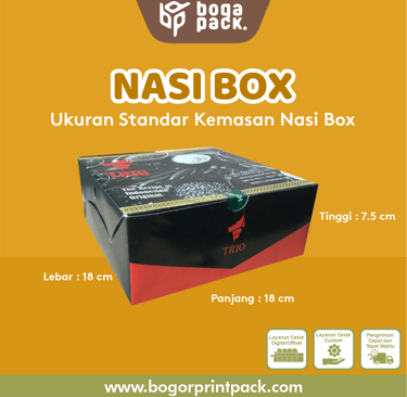 Nasi BOX banyak digunakan sebagai bahan kemas aneka kue untuk keperluan seminar, pertemuan, pernikahan, kedukaan, dan acara lainnya. Dapat dicetak full color (4 warna) ataupun 1 warna saja sesuai desain.